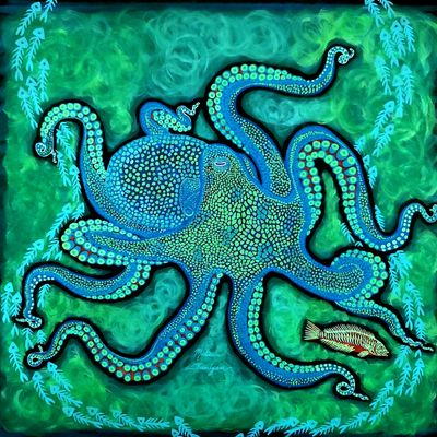 Meet "Spooky Octopus and the Slippery Dick™! This is an original acrylic painting done on wood that Madison freehanded and is her take on a spooky and completely made up octopus swimming and cruising around in the hightide along the jetties of Destin, Florida! The little red fish that she painted next to the octopus is her take on a spooky slippery dick. Yes, you read that correctly. It is a real fish (a type of wrasse) and one of the common species you will see if you snorkel around the jetties in Destin, Florida. Madison thought it was fitting with the octopus and hilarious. If it offends you, then just call it a wrasse and enjoy her art. Madison had to paint an octopus in this series, because she has always found them so very interesting. This particular octopus is a completely made up species that she had created by combining some of her favorite features of real species in her mind and this is how it came out.